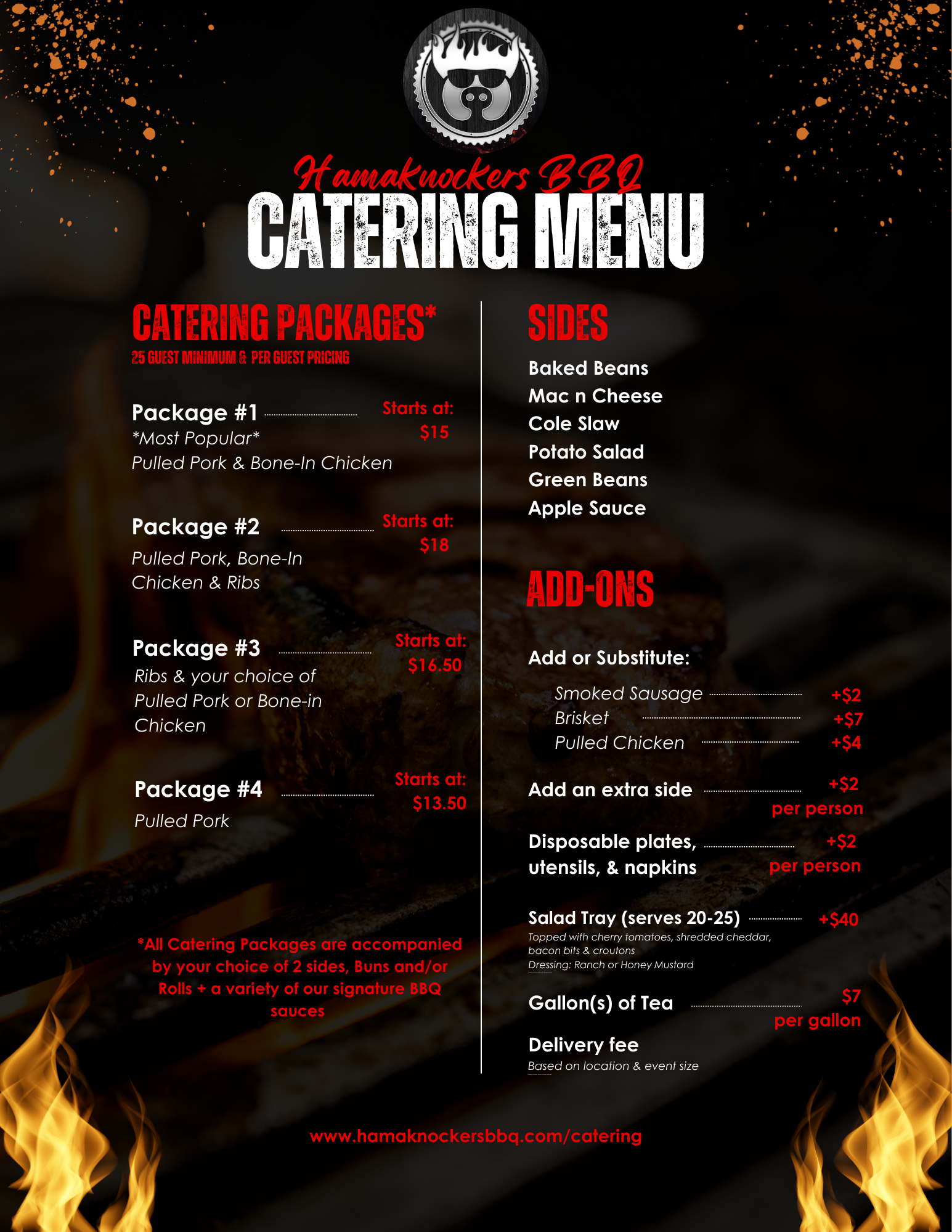 Hama Sides: Baked Beans, Corn on the Cob, Potato Salad, Cole Slaw, Green Beans, Apple Sauce, Mac & Cheese
